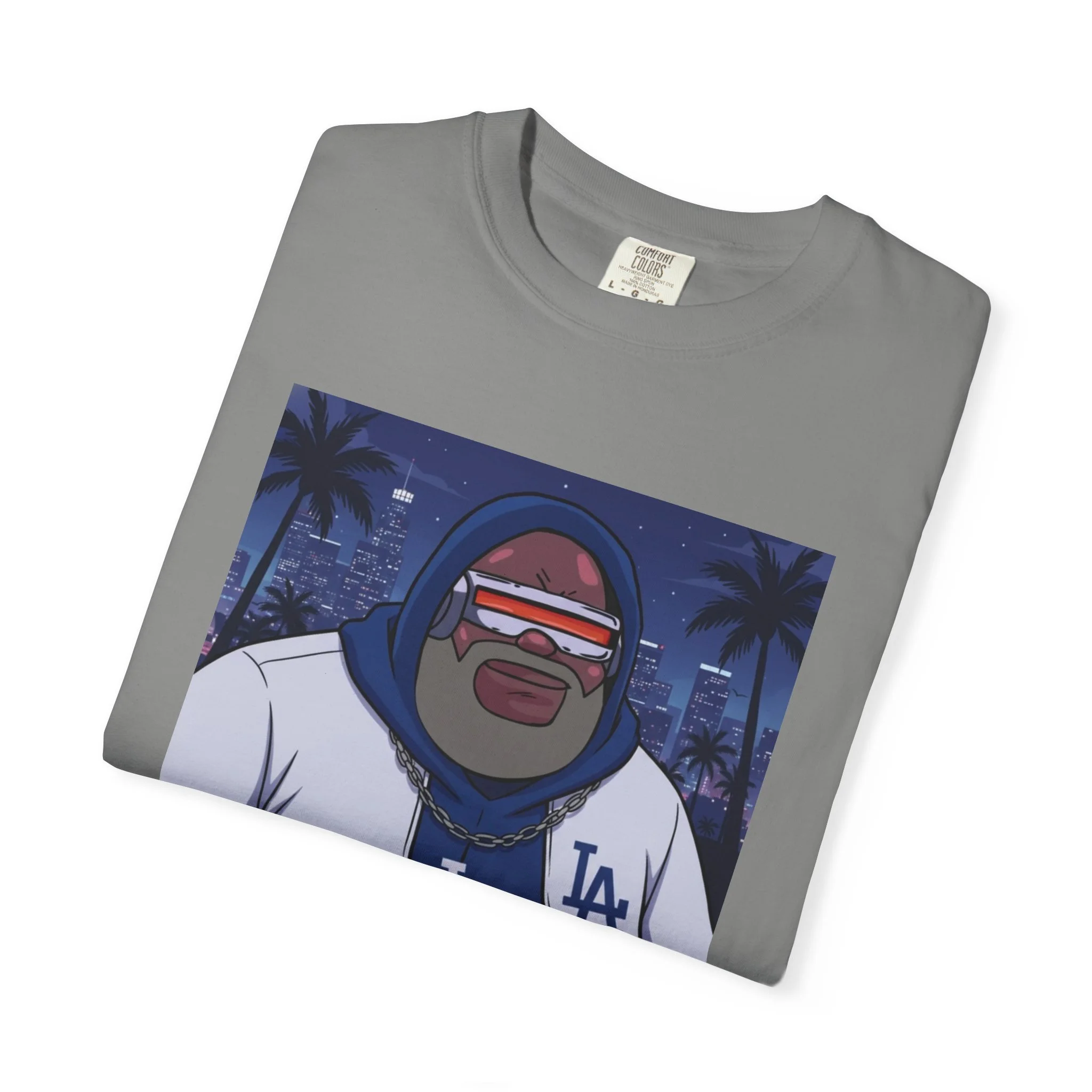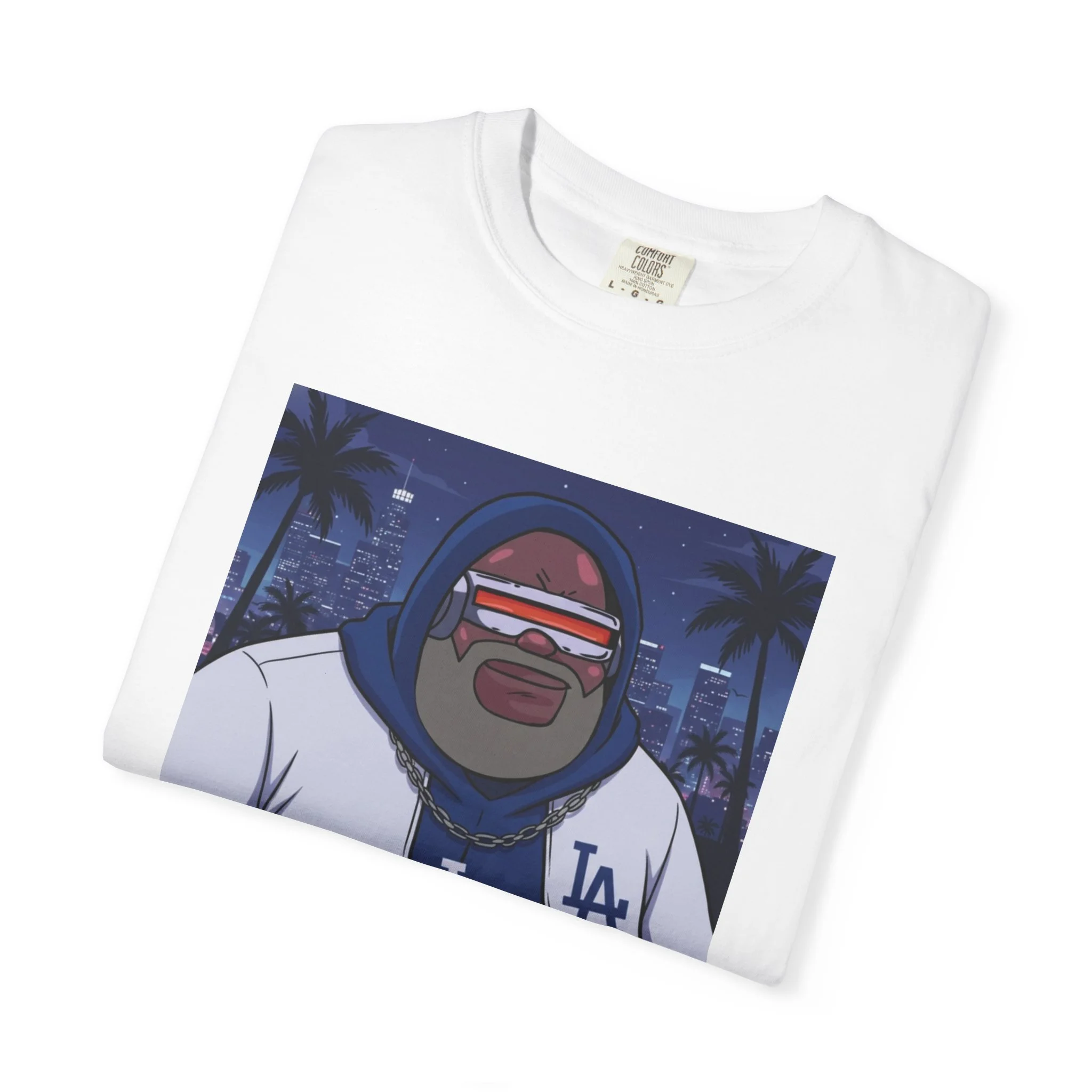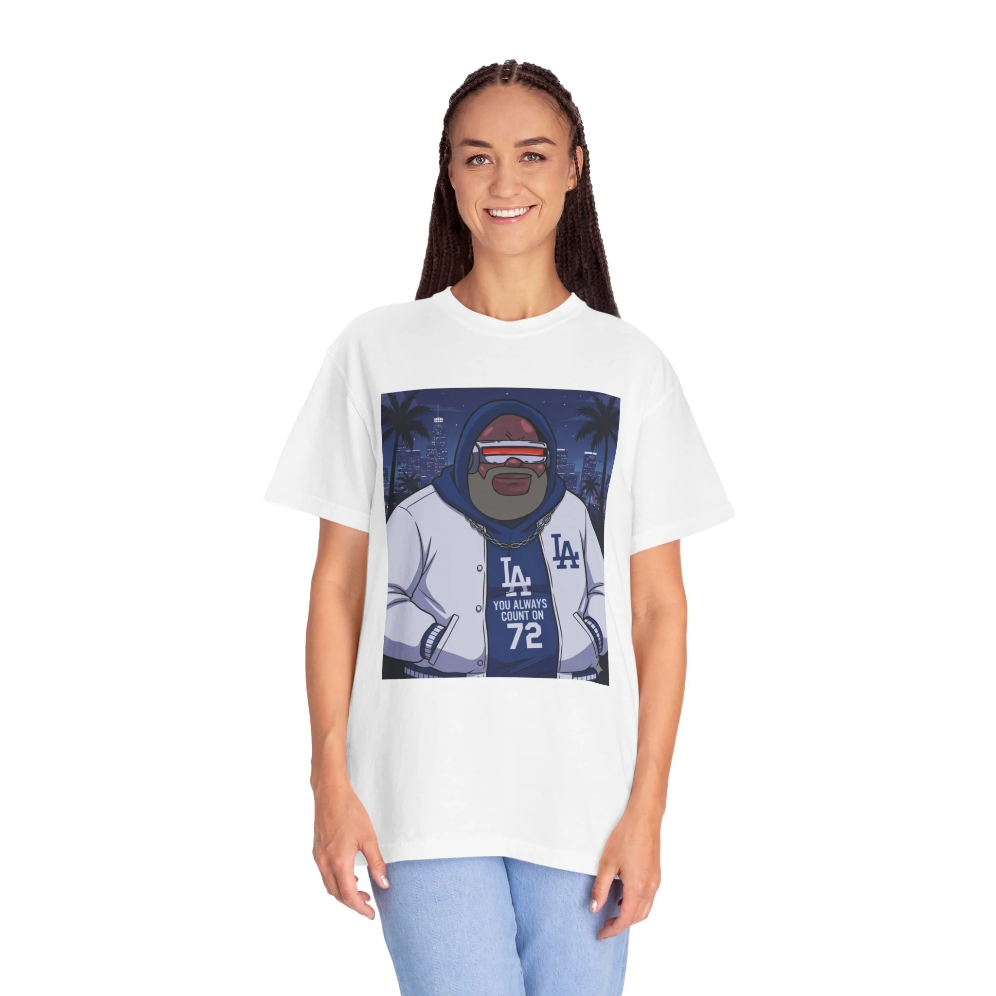 Alex Boddiccer pays respect to the Baseball World Champs and the catalyst of game seven that happened to be wearing the number 72. This relaxed, garment-dyed tee brings laid-back street culture into everyday wear. The soft, medium-weight cotton drapes easily and feels broken-in from day one thanks to after-construction dyeing. The front art—a stylized, nighttime LA scene with a hoodie-clad character and varsity jacket—carries city-night energy: palms, neon glow, and slow-roll attitude. It layers under jackets or stands alone as the look for late rides, meetups, and low-key shows. The tubular knit and double-needle stitching mean the silhouette stays clean and the seams hold up through repeat wear. Available in a wide range of colors and sizes, this tee fits into a casual, urban wardrobe that values comfort, texture, and quiet confidence.