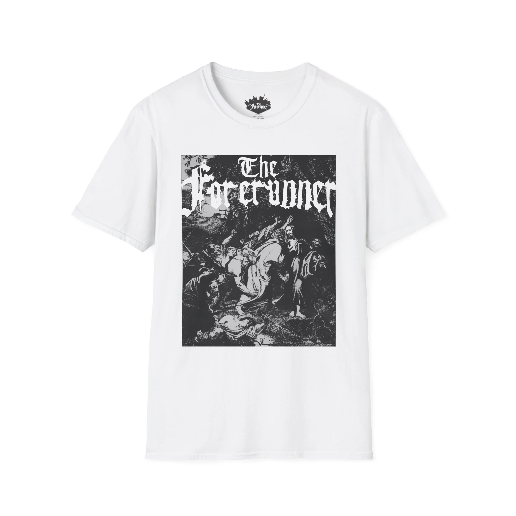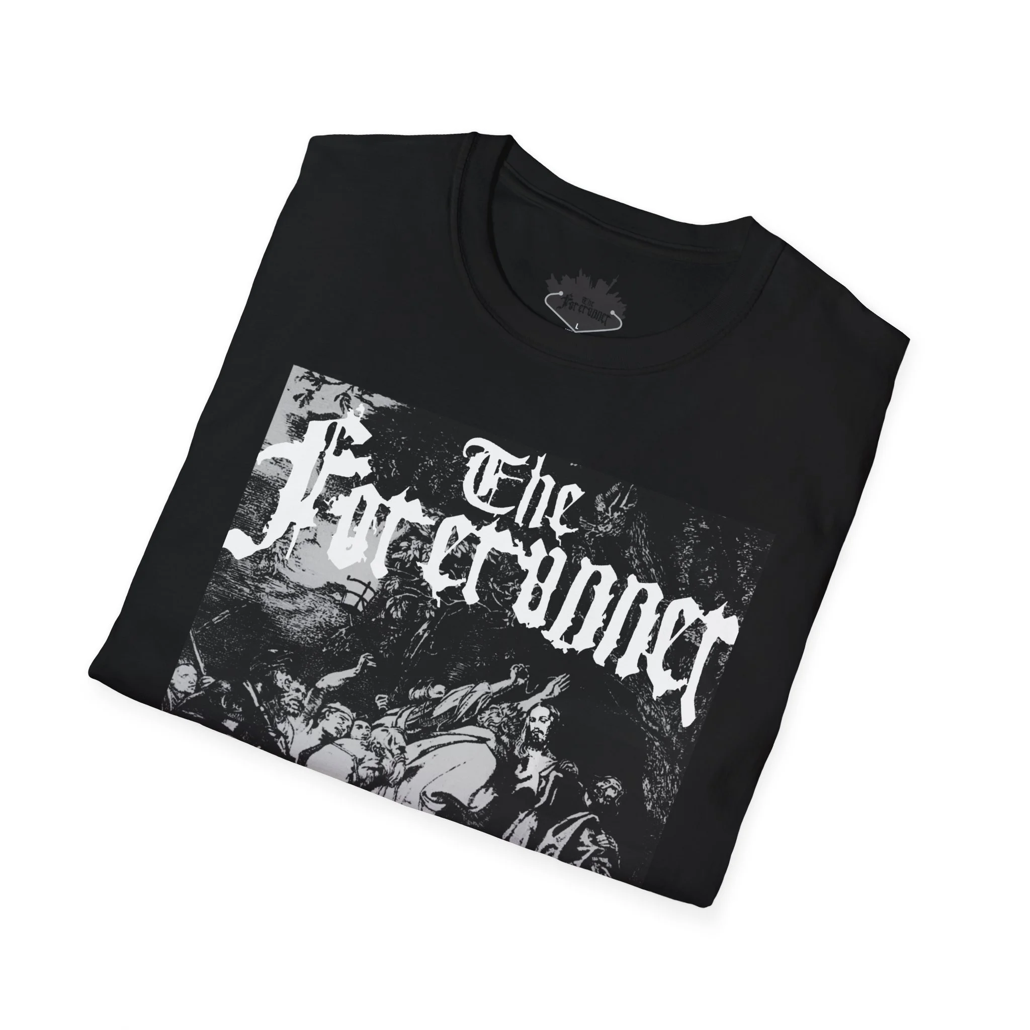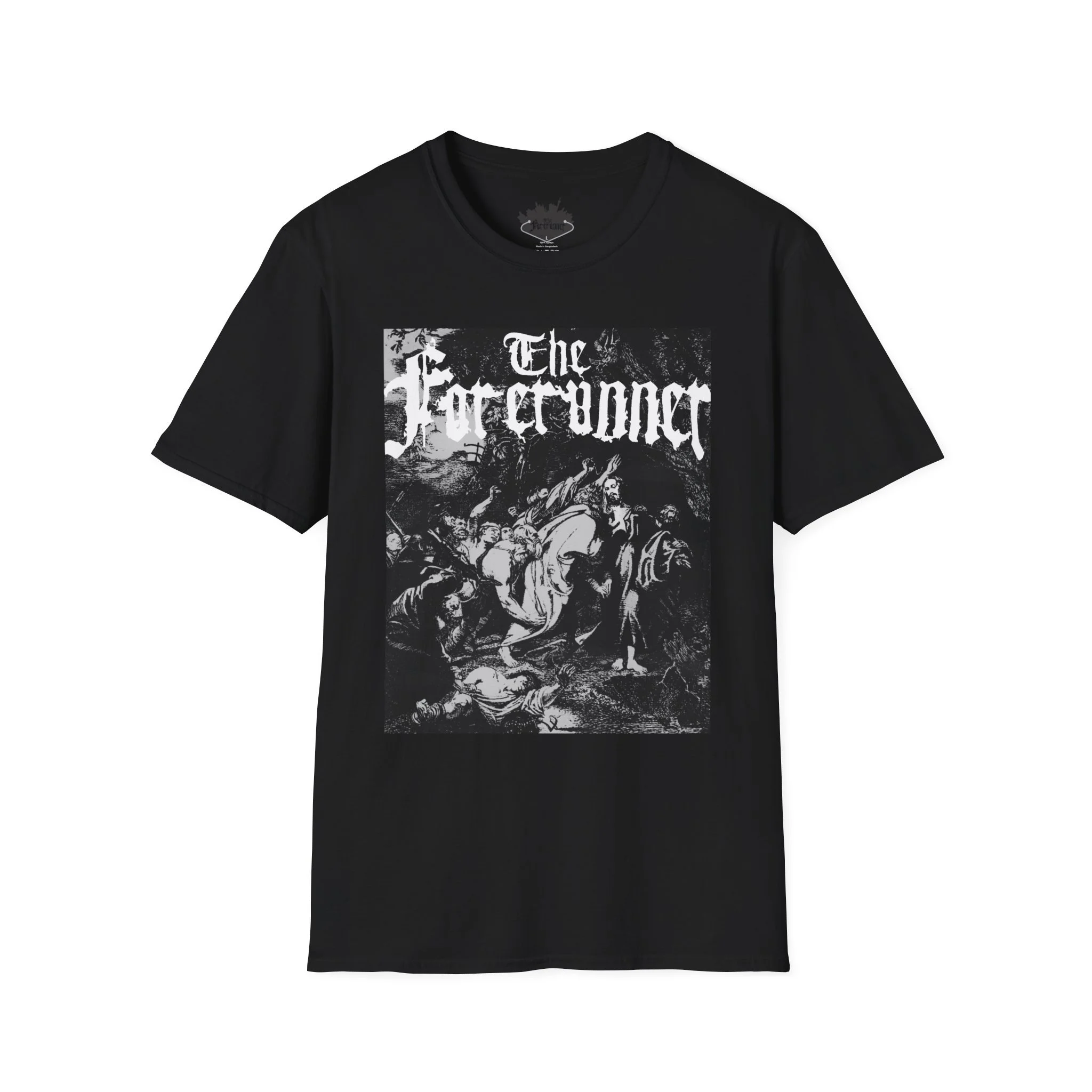The central graphic depicts the Betrayal in the Garden of Gethsemane. It is rendered in a dense, stippled engraving style. The scene captures the chaotic moment of arrest, featuring figures with raised swords and torches that cut through the darkness of the garden.This lightweight cotton tee carries a dark, vintage-black artwork that feels like a page torn from an old gothic folio. The high-contrast print sits across the chest, giving an unmistakable, brooding presence without shouting. Wear it when you want your outfit to echo late-night record crate digging, alleyway shows, or a slow, rainy walk through downtown — it settles into the look like a practiced riff. The soft ring-spun cotton and classic crew silhouette keep the shirt comfortable for long hours at gigs, rehearsals, or coffee-shop edits. Subtle details like a tear-away label and reinforced shoulder tape mean it endures repeated wear while keeping its shape and print clarity.