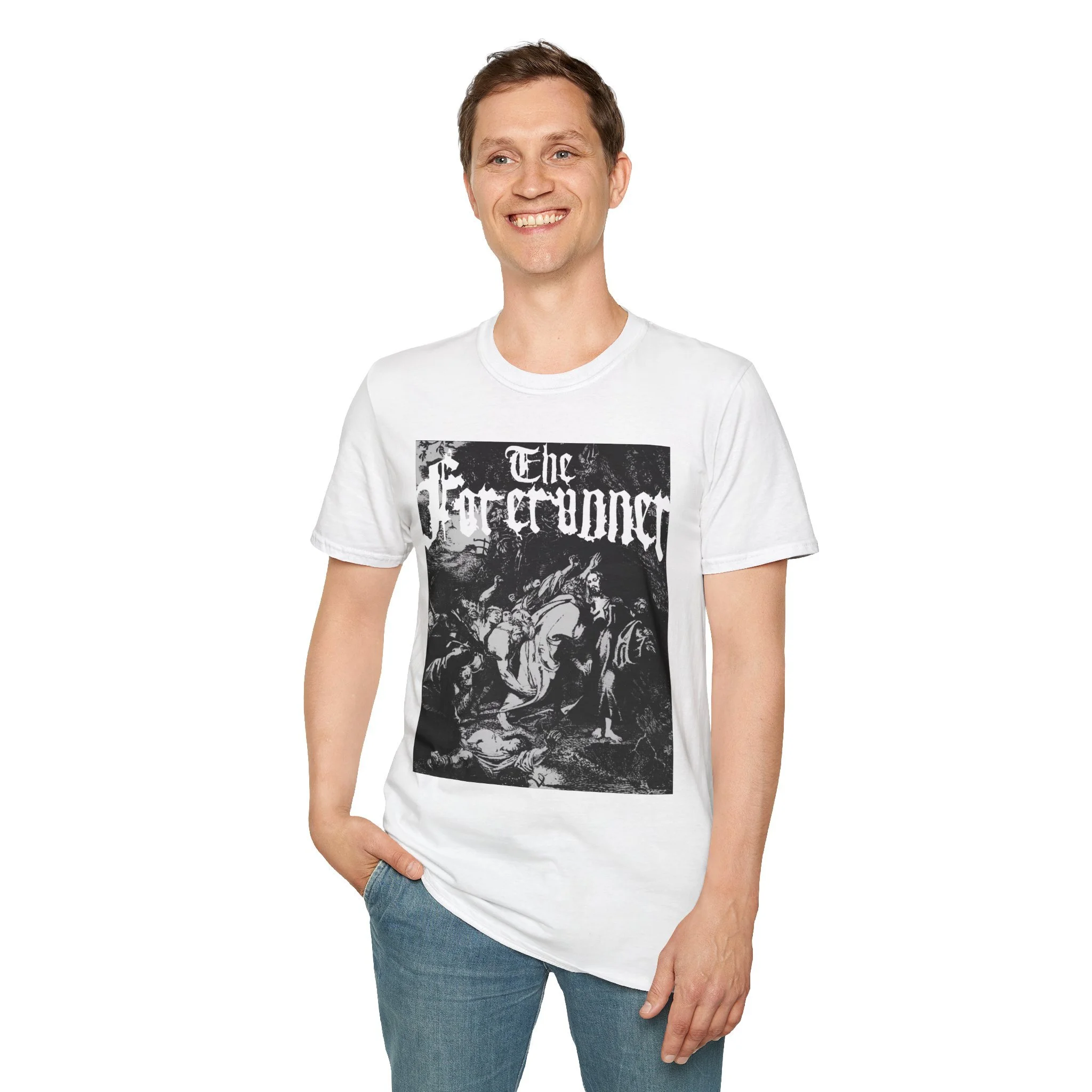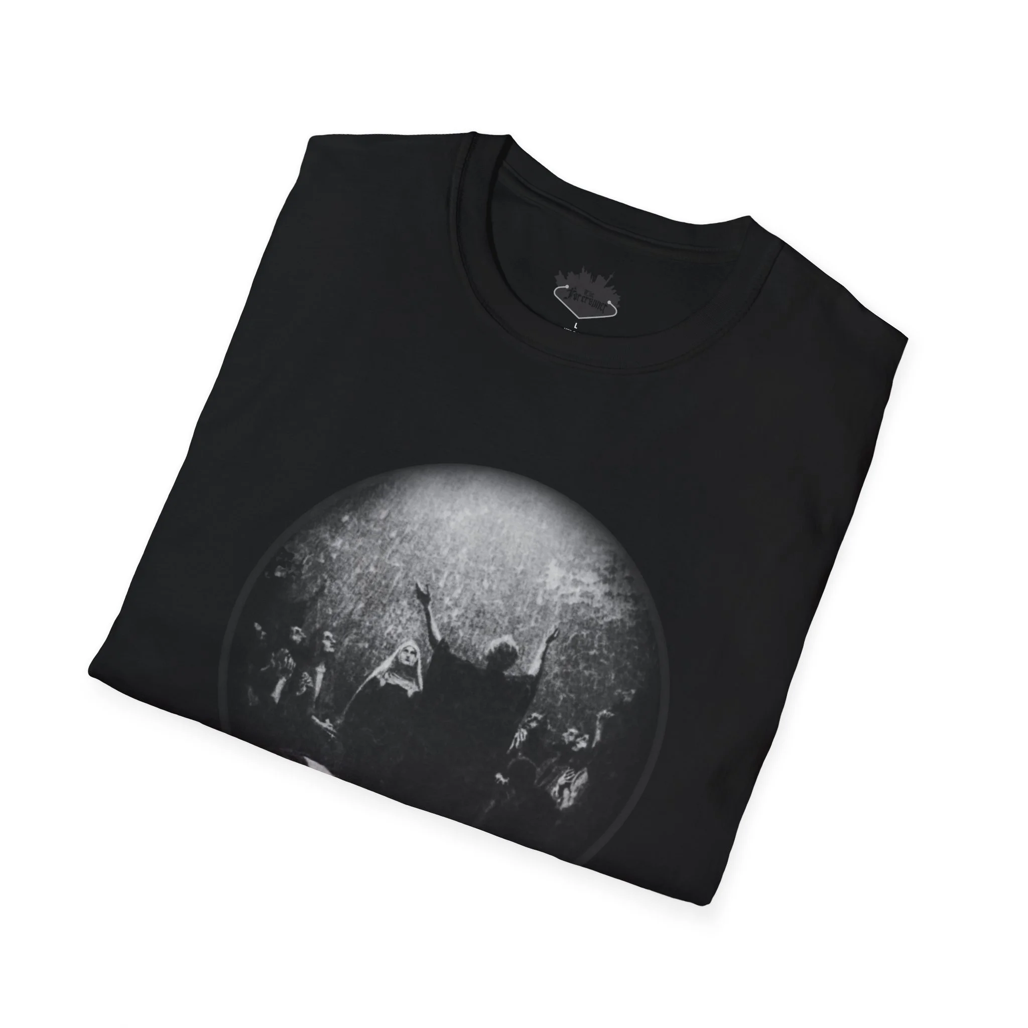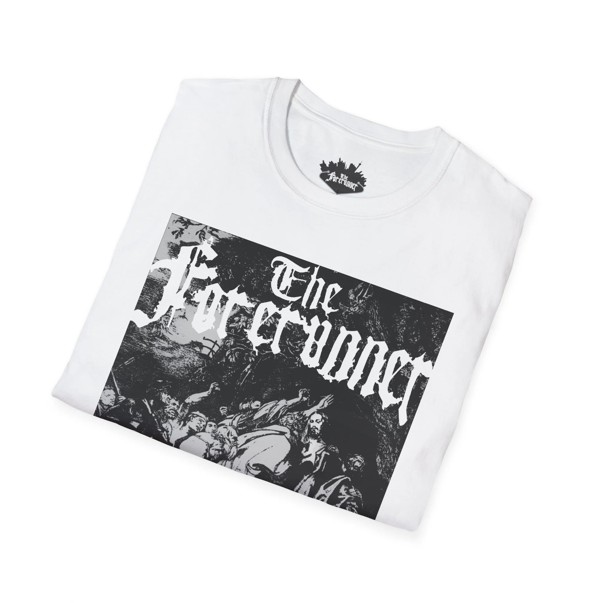 The central graphic depicts the Betrayal in the Garden of Gethsemane. It is rendered in a dense, stippled engraving style. The scene captures the chaotic moment of arrest, featuring figures with raised swords and torches that cut through the darkness of the garden.This lightweight cotton tee carries a dark, vintage-black artwork that feels like a page torn from an old gothic folio. The high-contrast print sits across the chest, giving an unmistakable, brooding presence without shouting. Wear it when you want your outfit to echo late-night record crate digging, alleyway shows, or a slow, rainy walk through downtown — it settles into the look like a practiced riff. The soft ring-spun cotton and classic crew silhouette keep the shirt comfortable for long hours at gigs, rehearsals, or coffee-shop edits. Subtle details like a tear-away label and reinforced shoulder tape mean it endures repeated wear while keeping its shape and print clarity.